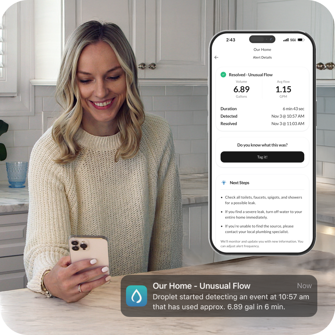 Droplet also alerts users to potential leaks in their home's plumbing, enabling early action to prevent significant damage.