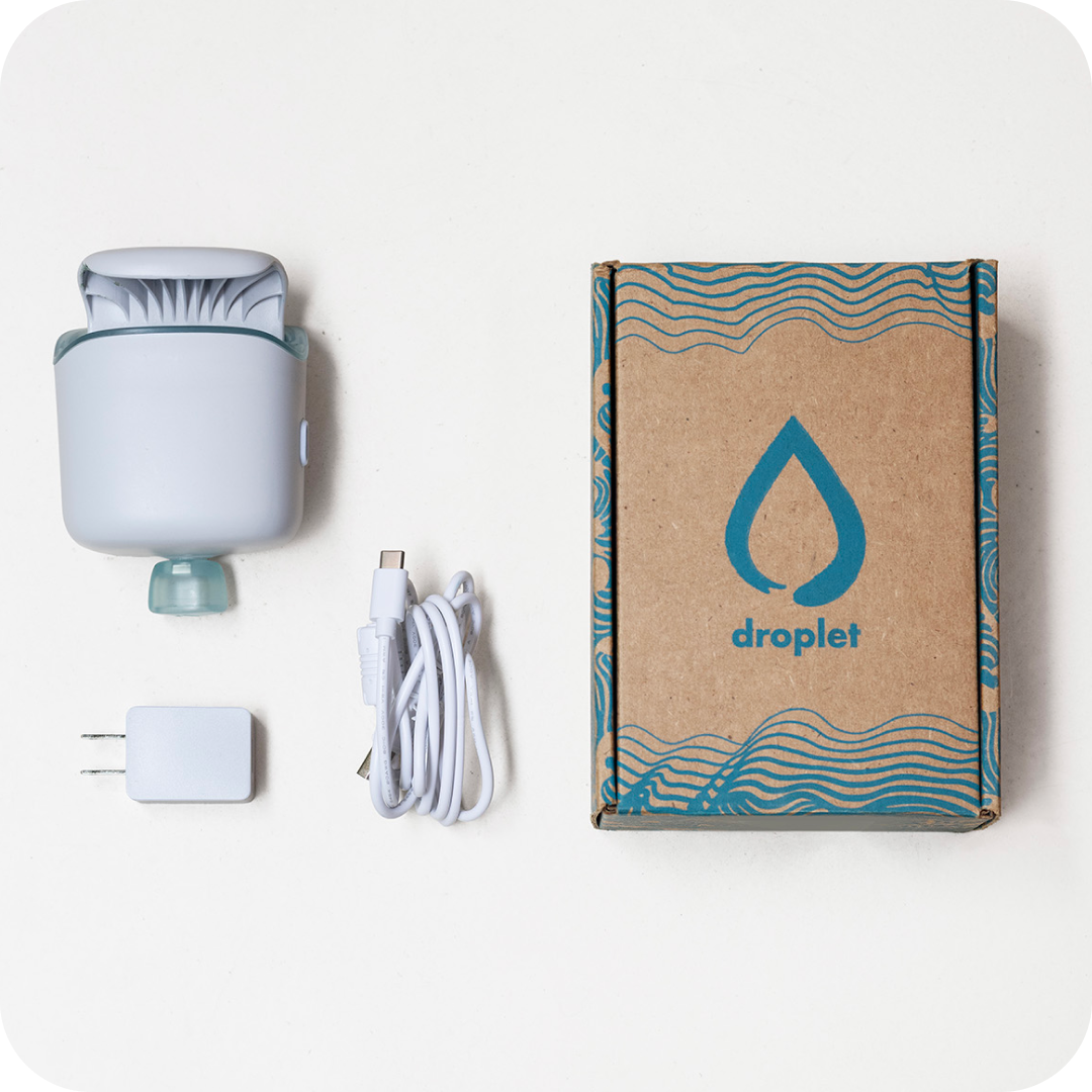 Droplet operates without the need for batteries. It uses a dedicated USB-C power cable with a standard USA plug that works with 110VAC power outlets.