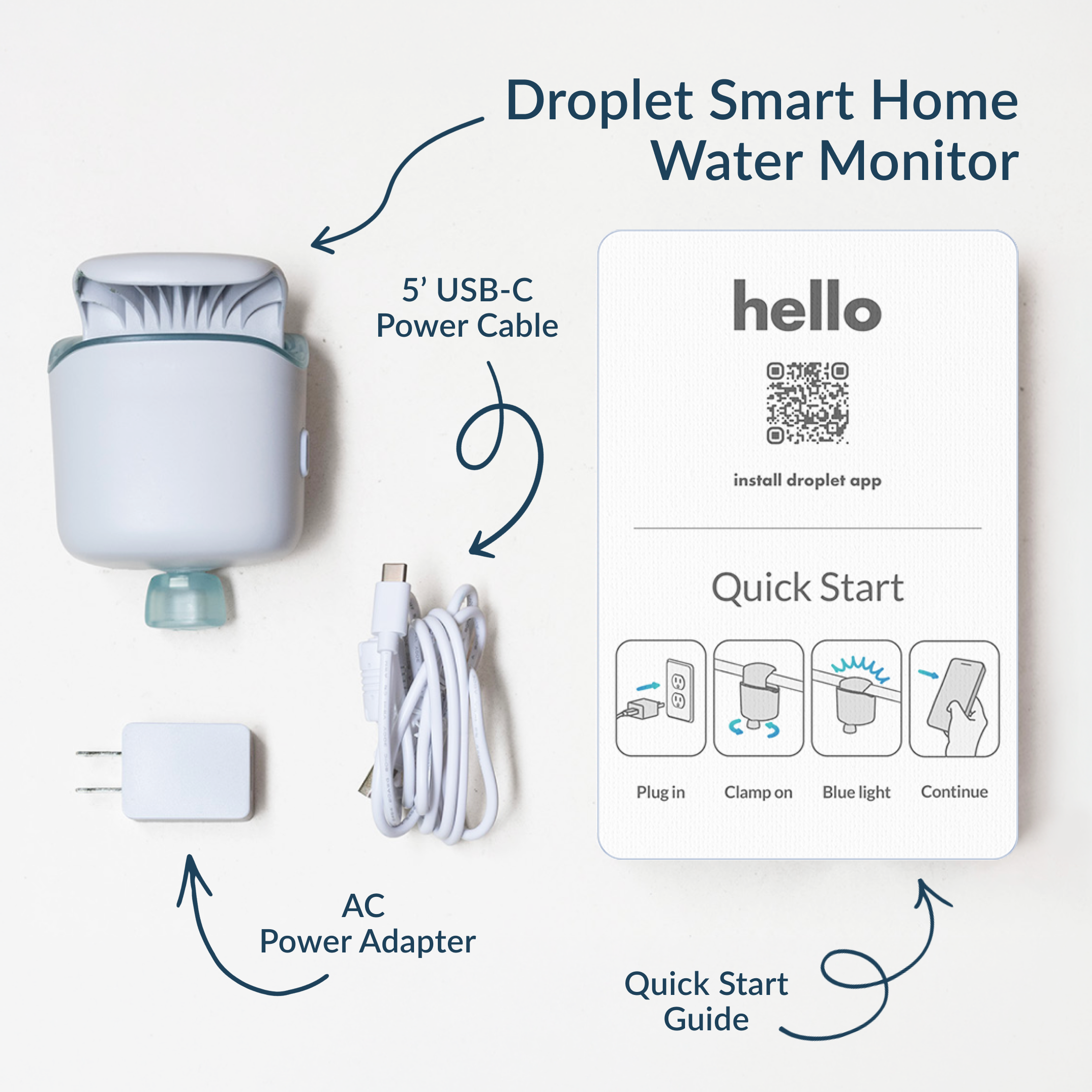 No special tools or equipment are required to install Droplet. Everything you need is included in the package, such as USB Power Cable and AC adapter.